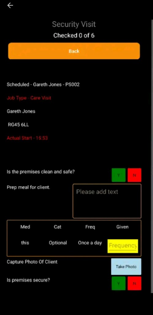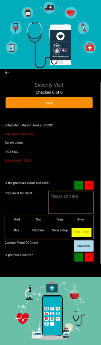 - Once at a property, the user will be given a list of tasks to perform. Once a task is completed then the user can tick a box on the page. If there is any medical data or any photographic images that need to be taken that these can be done through the mobile phone. Once all the tasks are complete the user is given the option to leave or add any further comments or actions required from their visit.